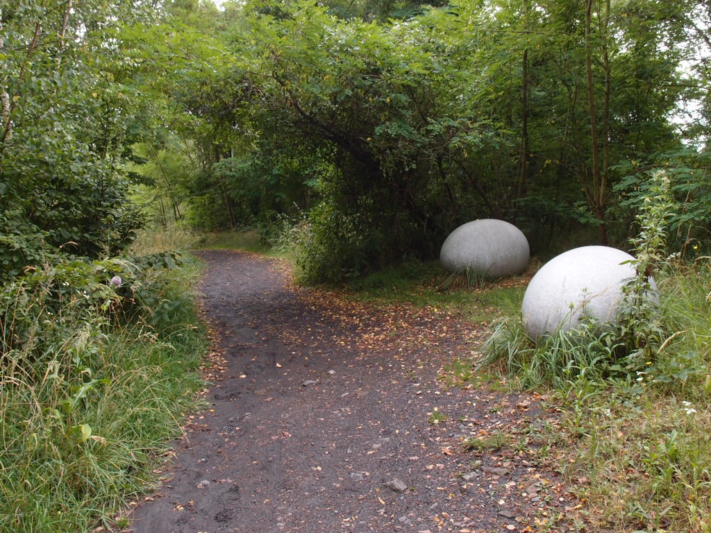 Zwei Strategien können wir finden, mittels derer hier Landschaft inszeniert wurde. Die eine ist Naturschutz. Parallel der Wanderwege wurden mittels alter Baumstämme und Gestrüpp durchgehende Barrieren errichtet, sodass das Verlassen der Wege unmöglich ist. An einigen ausgesuchten Stellen wurden ferner Stege und Aussichtsplattformen errichtet, die den Blick in das versperrte Gebiet wieder öffnen. Ergänzend klären Informationstafeln darüber auf, dass hier seltene und besondere Arten vorkommen – und schon ist das wilde Gestrüpp in eine schützenswerte Landschaft verwandelt. Die andere Strategie ist Kunst. Entlang des Weges stoßen wir wiederholt auf eiförmige Steinskulpturen. Auch sie kennzeichnen das Areal als ein besonderes. Aus den Schilderungen von Herrn Emundts ist jedoch herauszuhören, dass diese Objekte in der Bevölkerung lediglich recht geteilte Zustimmung finden.