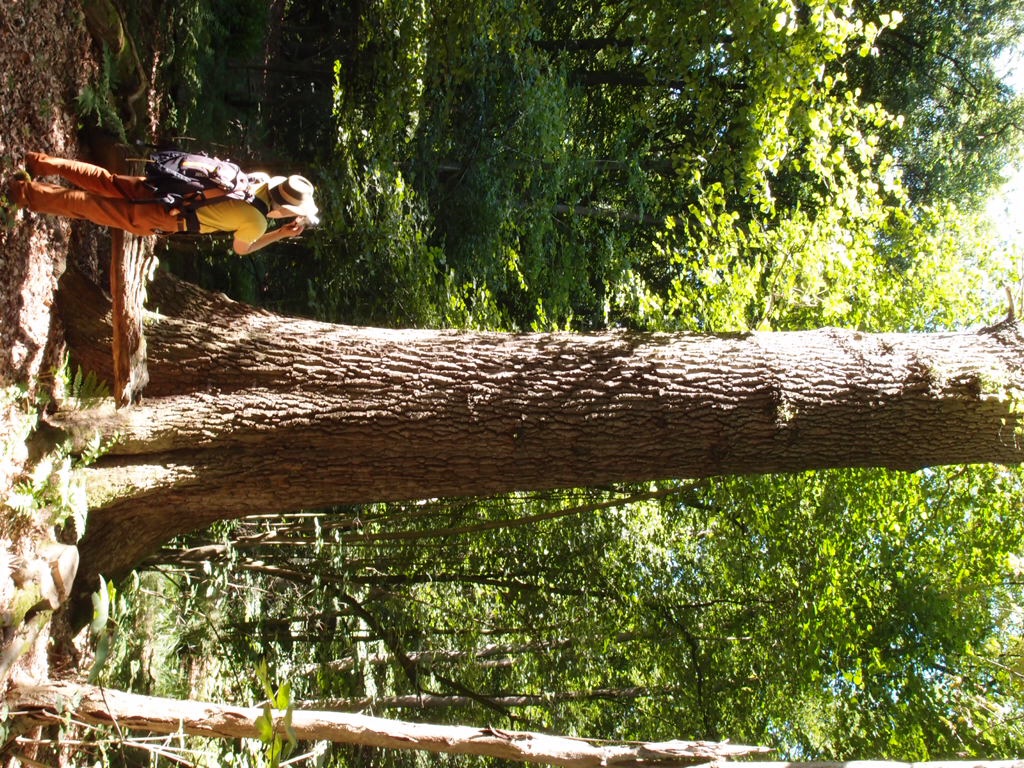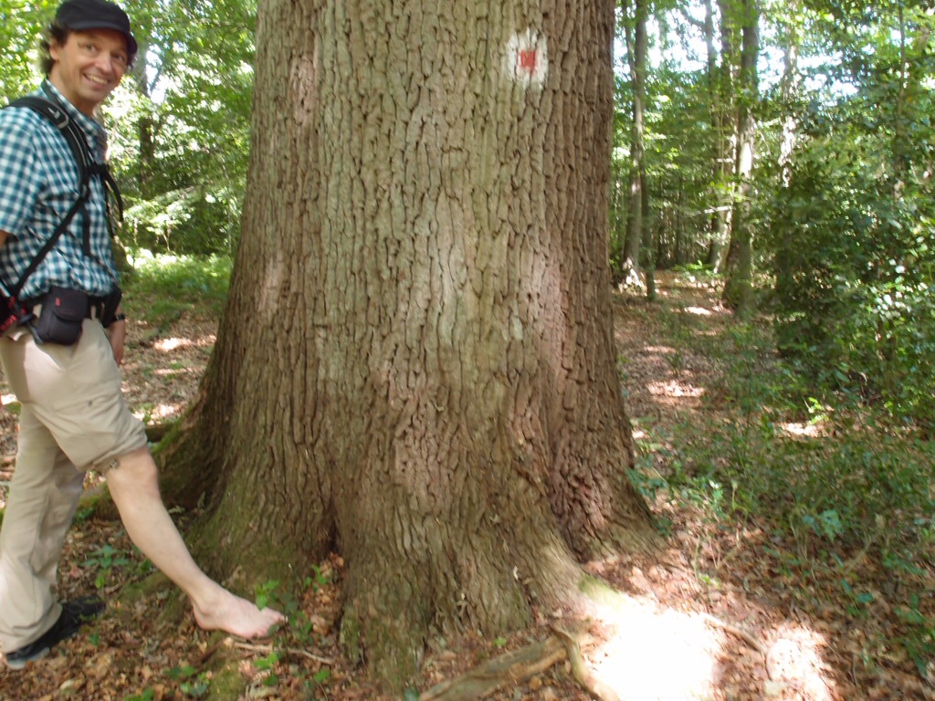 An kaum erkennbarer Stelle verlässt Peter den Weg, ich folge ihm durchs Dickicht in den Wald. Und da stehen sie, mit mächtigem Stamm, aber mit nur lichter Krone. Peter erklärt mir: „In einem gewissen Alter bekommen die Eichen eine Krise. Dann werfen sie einen großen Teil ihrer Krone ab und treiben dafür neue Seitenäste aus. Hundert Jahre später geht es ihnen dann wieder gut.” Viele alte abgefallene Äste und auch junge Seitentriebe kann man erkennen. Allerdings werde ich in hundert Jahren nicht noch einmal vorbeikommen. Peter führt mich noch durch ein nahes Waldstück, in dem eine naturnahe Methode der Waldverjüngung erprobt wird. Die jungen Buchen stehen derart dicht, dass ein Vorankommen schier unmöglich ist. Es leuchtet mir sofort ein, warum die Römer angeblich die tiefen germanischen Wälder verflucht haben sollen.