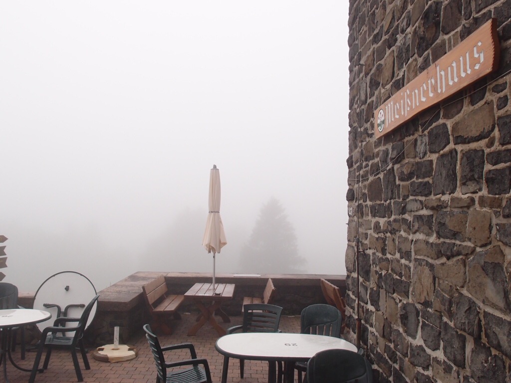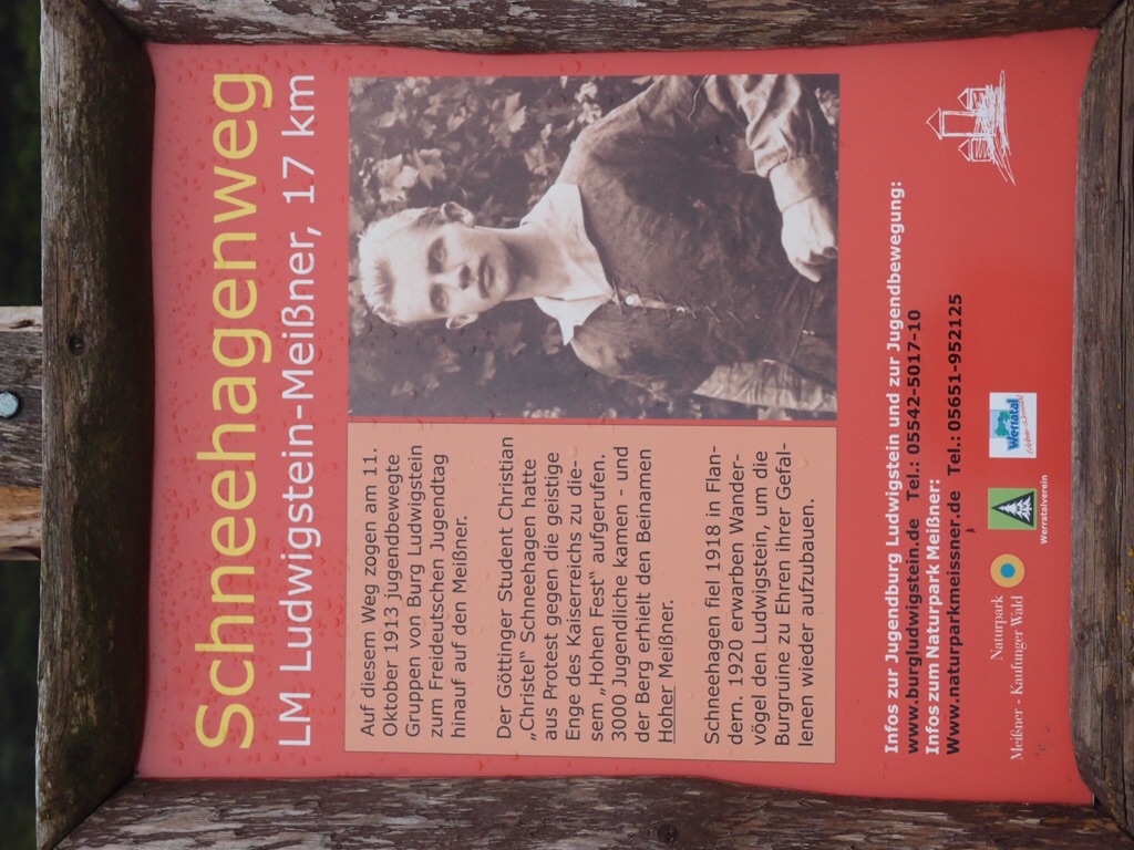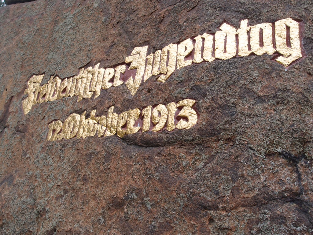 Dichter Nebel ist in mehrfacher Hinsicht sehr passend für diesen Berg. Auch die Geschichten und Mythen zu dem, was sich hier 1913 an einem regnerischen, nebeligen Tag auf dem Meißner zugetragen hat, sind nicht so einfach zu durchdringen. Auch wegen dieser Geschichte kam ich hier hoch. Auf einige Kernpunkte hat sich die Geschichtsschreibung geeinigt: Am 11. und 12. Oktober 1913 trafen über zweitausend Jugendliche und Jugendbewegte auf dem Meißner zusammen, zu einem „Fest der Jugend“, das als „Erster Freideutscher Jugendtag“ in die Geschichte einging. Darunter fanden sich auch einige, die später noch Spuren hinterlassen sollten, so etwa Walter Benjamin oder Alfred Kurella, der nach dem Zweiten Weltkrieg die Kulturabteilung beim ZK der SED leitete und Präsident des Schriftstellerverbandes der DDR wurde. Auf Grund der als „heiligen und hohen“ empfundenen Stimmung bei diesem Treffen und durch die Berichterstattung darüber hat sich für den zuvor nur Meißner genannten Berg der Name „Hoher Meißner“ durchgesetzt. Berühmt wurde auch die bei dem Treffen gemeinsam verkündete Meißnerformel: