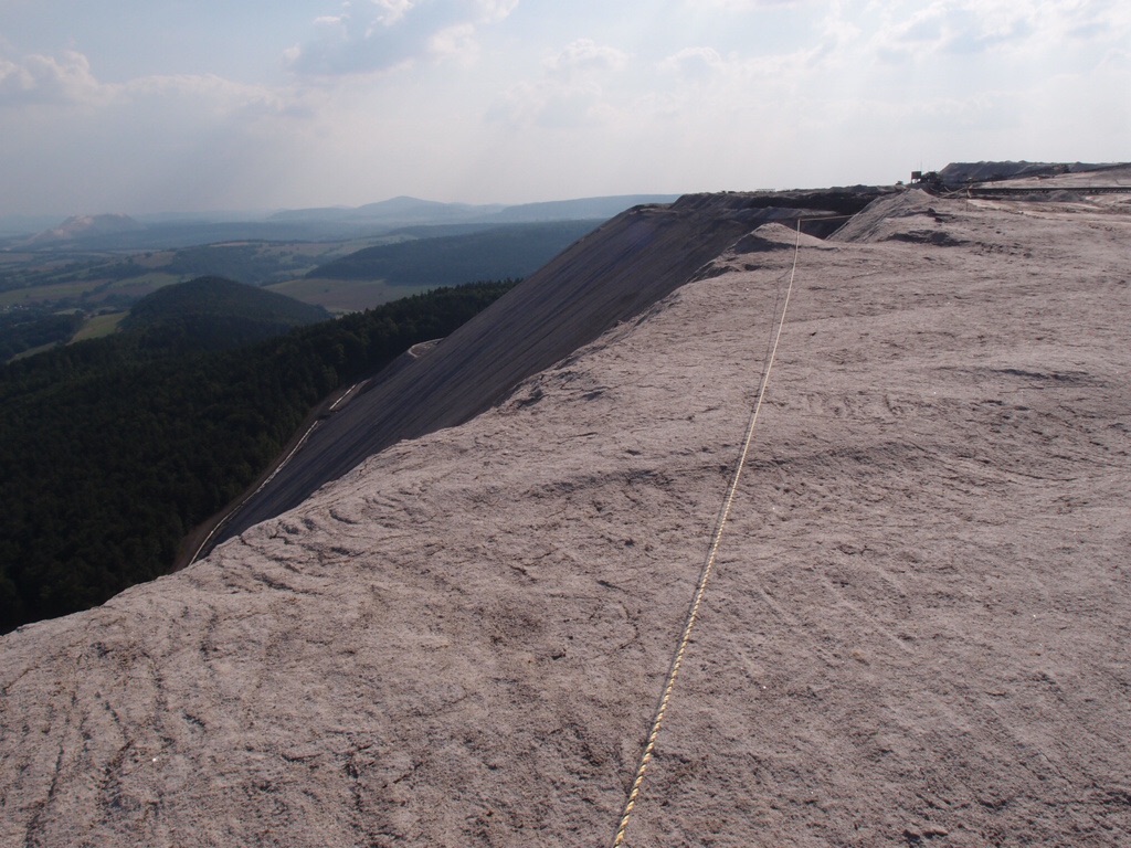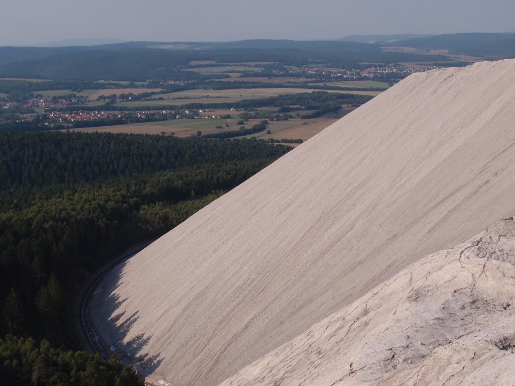 Später komme ich dann noch ins Gespräch mit einem freundlichen Herrn aus Heringen. Er beschreibt mir den Monte Kali als das „Wahrzeichen“ dieser Stadt. Na toll, denk ich mir. Oder auch: Haben die Leute hier vielleicht alle Kali gekokst? Welche Wahrheit gab es denn, bevor das Band eingeschaltet wurde? Und welche Wahrheit wird übrig bleiben in dieser Stadt, sobald das Band eines Tages abgestellt wird? Denn jeder Bergbau ist endlich – so lautet ein anderes Mantra. Das „Wasserzeichen der Stadt“ wäre eine zutreffende Bezeichnung für diesen Berg. Wie bei einem Geldschein muss man auch hier genau hinschauen, um das Wasserzeichen zu erkennen: Wenn der Berg jährlich um sechs bis sieben Meter „abschmilzt“, wird es geschätzt etwa vier oder fünf Jahrzehnte dauern, bis der Berg durch den Regen irgendwann einmal weggespült sein wird. Wer oder was garantiert, dass auch nach Ende der Förderung – also nach dem Ende finanzieller Gewinne – noch über weitere Jahrzehnte die Sickerwässer aufgefangen und behandelt werden? Daran kann man eigentlich nur glauben auf einer Grundannahme, dass sowohl das jetzige Wirtschafts- als auch das Gesellschaftssystem ohne größere Verwerfungen für mindestens weitere fünf Jahrzehnte fortbesteht. Nur: Wer kann das garantieren? Und wer kann daran wirklich noch glauben? Noch nicht ganz vergessen ist die Finanzkrise, als Millionen- und Milliardenvermögen wie Bierschaum dahin schwanden. Und wer könnte die Fortsetzung der jetzigen Welt über weitere fünfzig Jahre überhaupt wollen? Schließlich würde das ja bedeuten, dass noch weiterer solcher Halden hinzukämen, die dann ebenfalls den Niederschlägen ausgesetzt wären. Wie diese Halde, so wird also auch die Problemlage und das Risikopotential kontinuierlich größer, je länger „das Band“ noch läuft. Nicht nur hier.