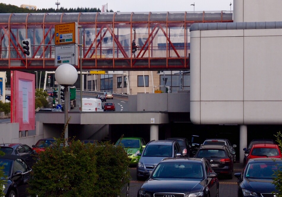 Am folgenden Tag durchstreife ich diese Stadt von Süden nach Norden. Was mir dabei begegnet, ist sehr oft die Fortsetzung der Geste der Siegtalbrücke: Alles ist machbar. Wo ich auch entlang komme, stets erblickt man die Anpassung der Stadt an das System Auto. Durch ihre ausgeprägte Topografie ist die Stadt Siegen für eine solche Anpassung denkbar ungeeignet. Zugleich aber bringt diese Topografie auch einige Vorzüge der Automobilität besonders deutlich zum Ausdruck. Und für die Lösung der baukonstruktiven Probleme findet sich immer ein Ingenieur. Was also könnte man da noch sagen?