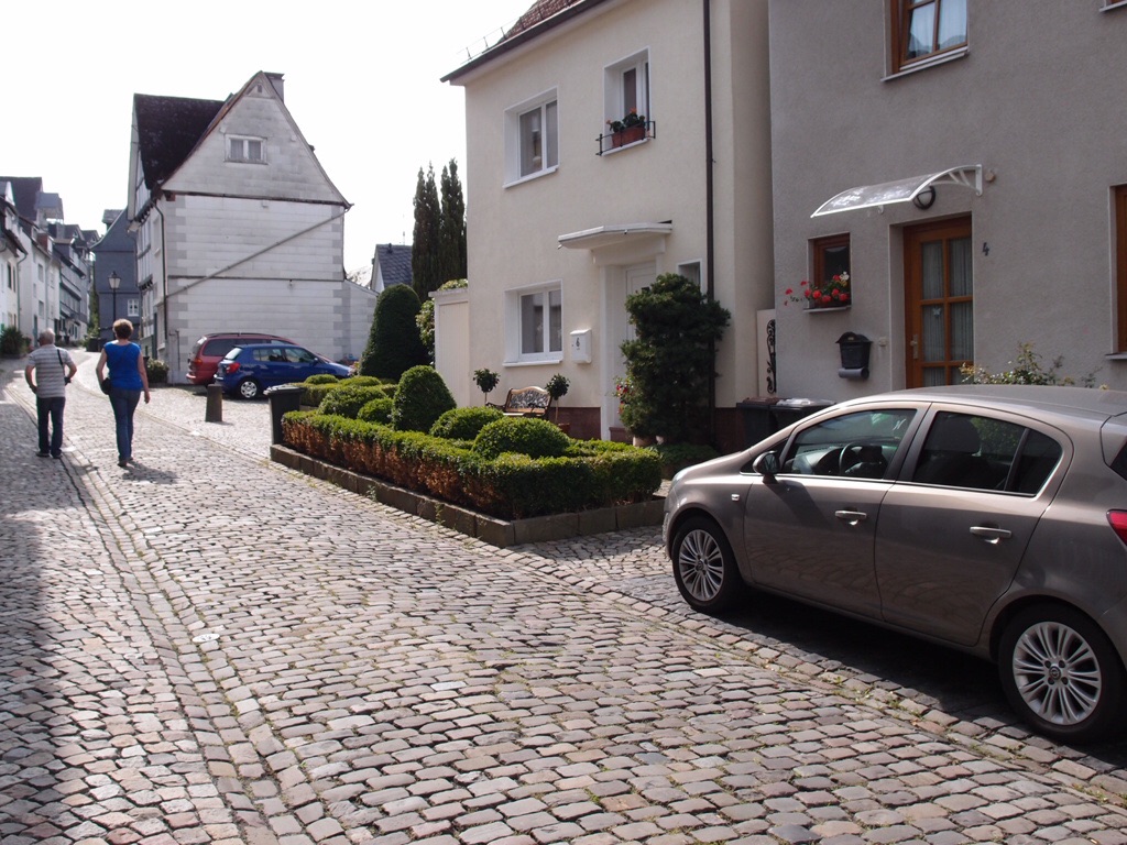 Zur Überwindung von Sprachlosigkeit ist es mitunter hilfreich, einfach einmal aufmerksam hinzuschauen. Oder auch, einen etwas anderen Blickwinkel zu suchen. Dieser Gedanke führt mich durch diese Stadt. Ein Vorzeigeprojekt will ich gerne beim nächsten mal besichtigen – heute suche ich den „Blick von hinten“ auf den Alltag. Mit am eindrücklichsten wirkt auf mich eine Situation in einer kleinen Nebenstraße der Altstadt: Zwei direkt benachbarte Häuser haben eine jeweils gleich große Vorfläche. Das eine mal stellt sich diese dar als liebevoll gestalteter Vorgarten. Im anderen Beispiel dient die Fläche zum Abstellen eines (geliebten) Autos. Schöner kann man die Frage „Wie wollen wir leben?“ nicht illustrieren.