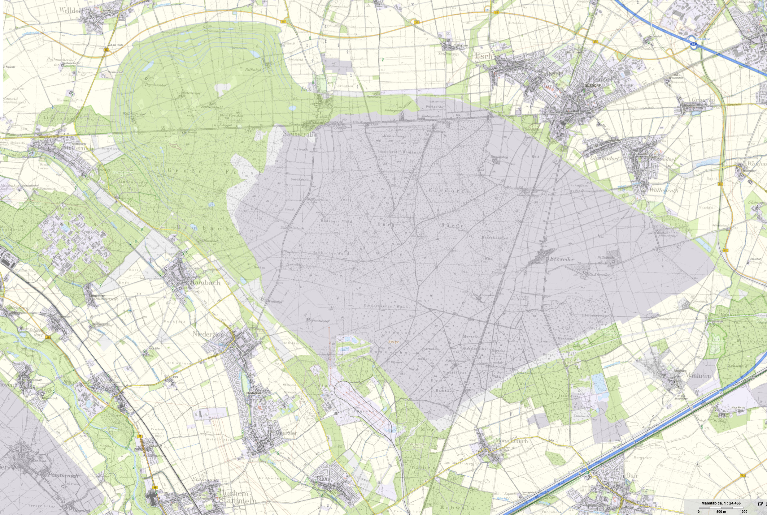 graue Fläche Kartenmitte –> ungefähre Ausdehnung des Tagebaus Hambach
